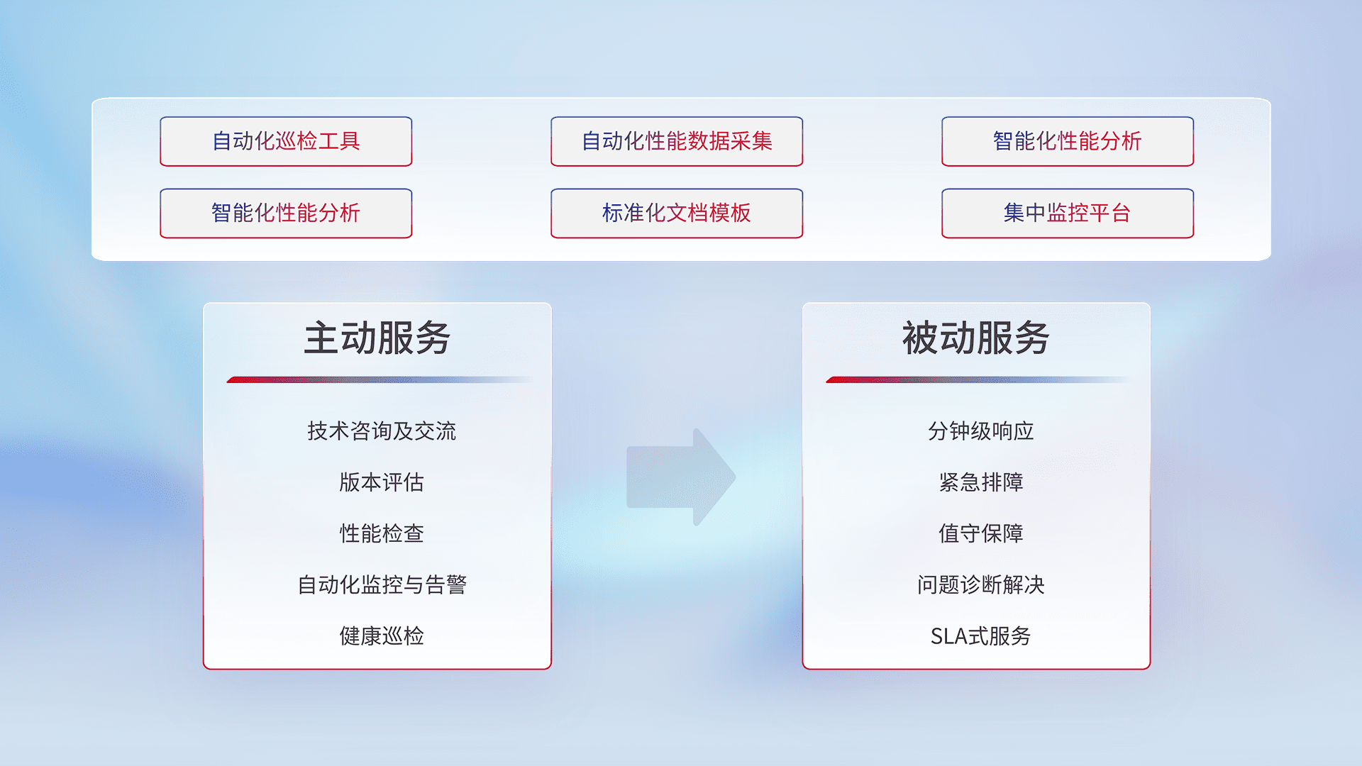 智能化工具和标准化文档,,,保障服务质量,,,提供主动服务(包含技术咨询、、、版本评估、、、性能检查、、、、自动化监控与告警、、、、健康巡检)和被动服务包含(分钟级响应、、、紧急排障、、值守保障、、问题诊断解决、、、SLA服务)。。。